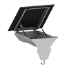 Utvendig er det en kile i speilblank rustfritt stål som er tilpasset for å passe mellom skjermene, på oversiden er det et lokk som er mulig å åpne, laget av dørkplate.